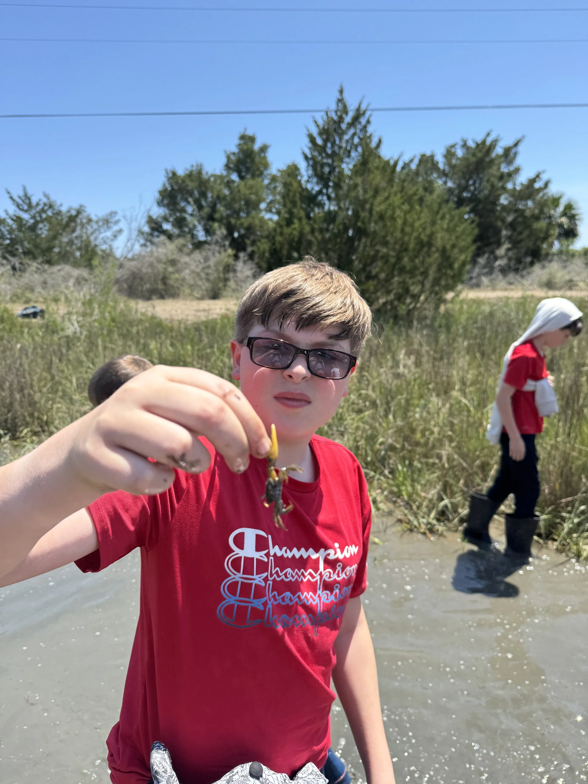 The first class of the day was a squid dissection. Some students were fascinated and loved the hands-on learning, while others bravely powered through the experience! After lunch, we boarded buses for a saltwater marsh ecology class. Students fully embraced the adventure—getting quite muddy (as you’ll see in the pictures!)—and many successfully caught crabs.
